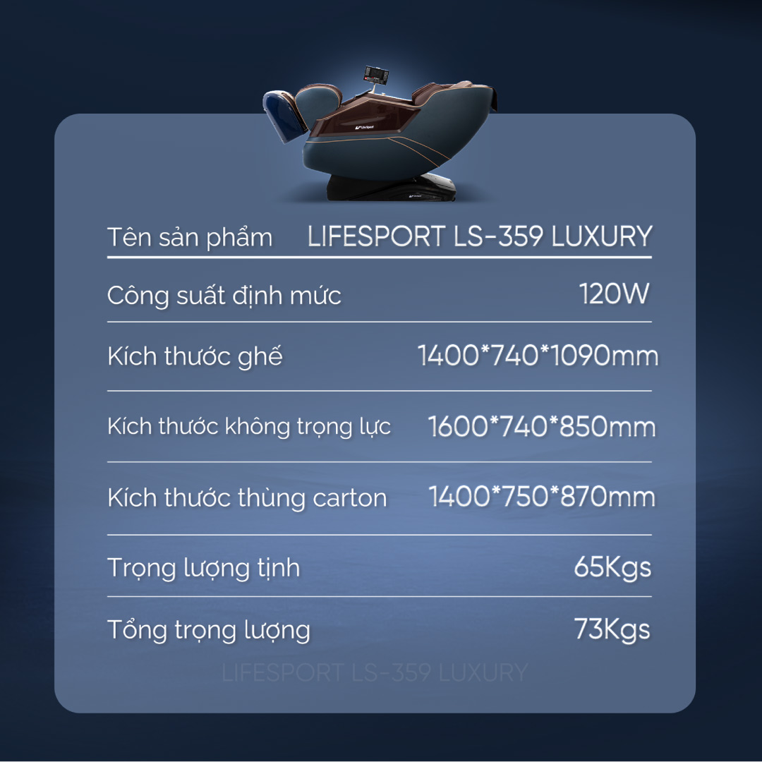 Ghế massage Lifesport LS-359 Luxury là phiên bản cải tiến với thiết kế hoàn toàn mới cùng các tính năng vượt trội, phù hợp cho mục đích thư giãn và nâng cao sức khỏe của mọi gia đình.