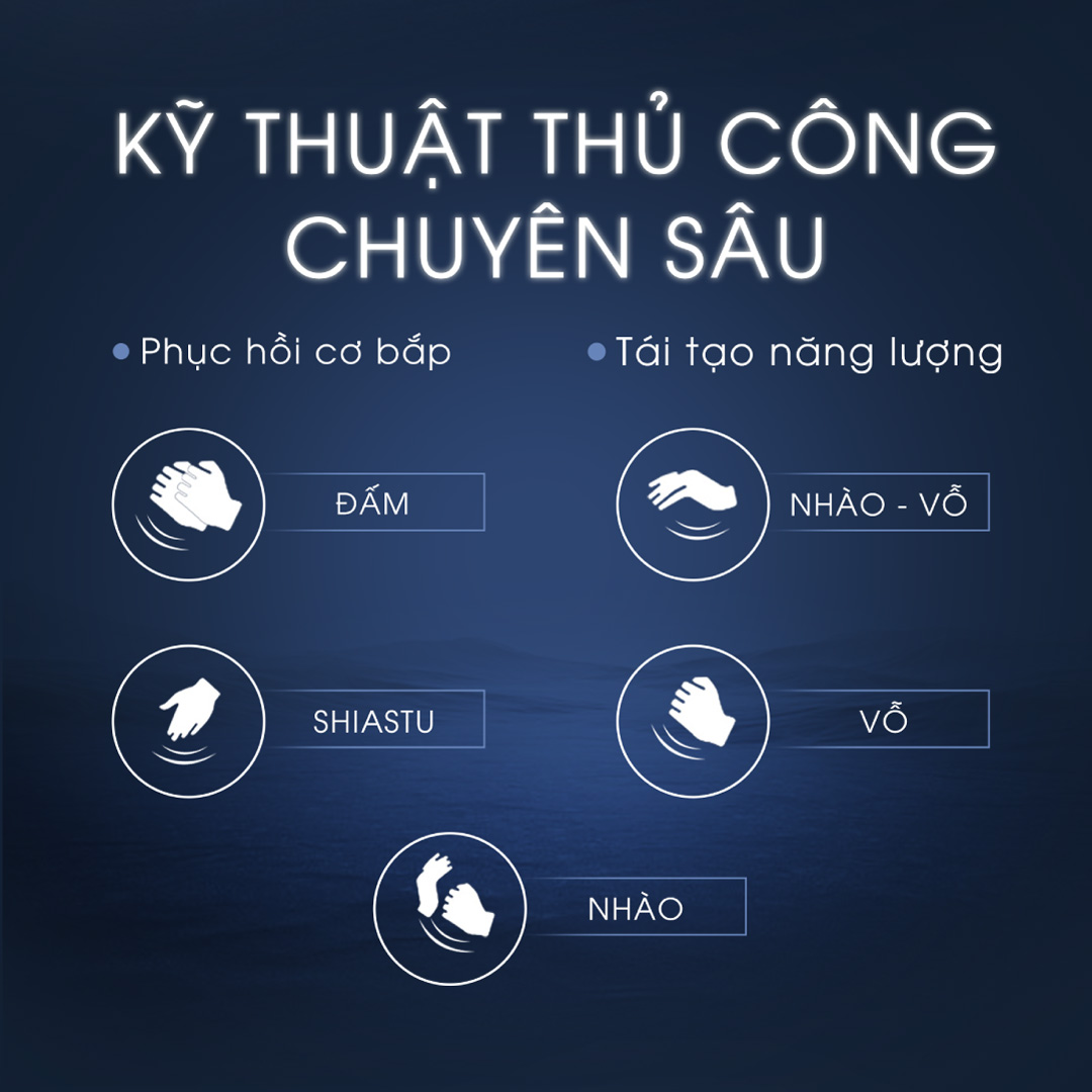 Các kỹ thuật bao gồm nhào, đấm, vỗ, shiatsu, nhào vỗ,… được thực hiện một cách chân thật và chuyên nghiệp, giống như bàn tay của các chuyên viên mát-xa.