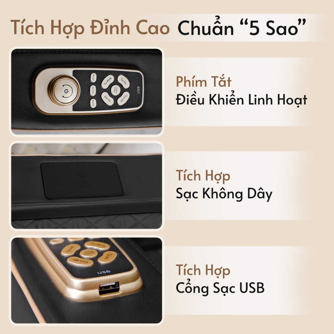Khi nằm trên ghế cần điều chỉnh góc ngả hay bật, tắt máy, chọn các tính năng cơ bản thì chỉ cần sử dụng phím tắt tích hợp ở tay vịn, rảnh tay thư giãn.