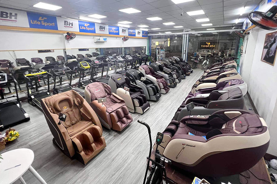 Cửa hàng có nhiều sản phẩm ghế massage, máy chạy bộ và xe đạp tập chính hãng